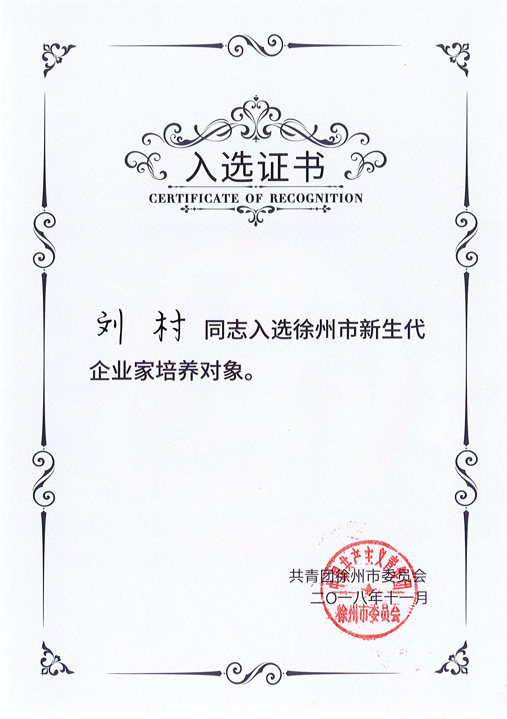 【喜讯】热烈祝贺徐州世润德环保科技有限公司董事长刘村同志入选徐州市新生代企业家培养对象
